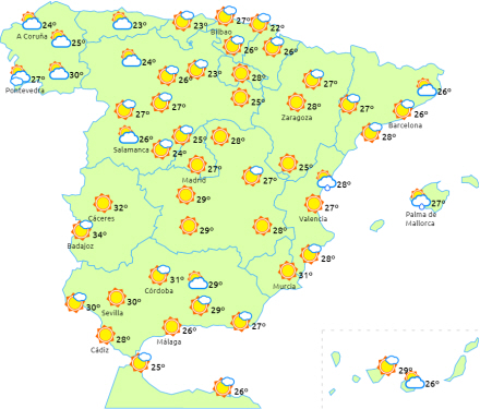 Letskyet til klart i resten af landet, dog afbrudt af perioder med overskyede himmel over de nordlige egne af De Kanariske Øer, højtliggende skyer over den vestlige halvdel af halvøen og efterhånden også nogle skyer i løbet af dagtimerne over den østlige halvdel.
