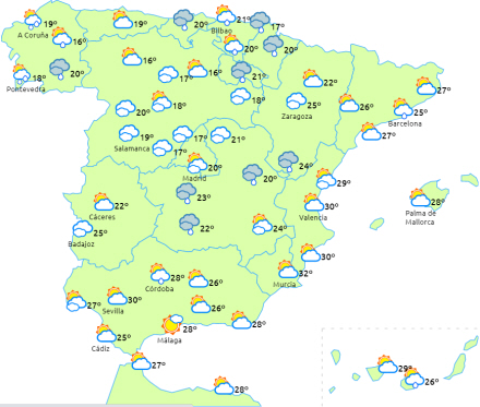 Faldende temperaturer i dagtimerne til det meste af halvøen, men især i den øvre Ebro-dal og den østlige ende af nordvestkysten, hvor faldet vil være ret bemærkelsesværdigt. Få ændringer eller let stigende i den sydlige del af halvøen, langs Middelhavskysten og på De Baleariske Øer.