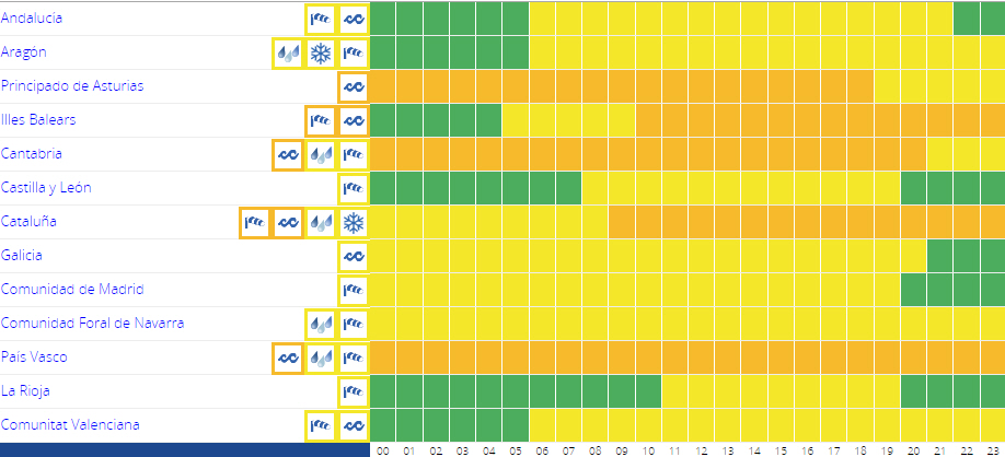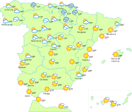 Lokalt stærk eller vedvarende nedbør i Cantabrien, Navarra og Pyrenæerne, mens der varsles hård vind med meget kraftige vindstød i den nordøstlige tredjedel af halvøen og på De Baleariske Øer.