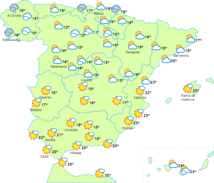 Faldende dagstemperaturer på halvøen, og det er særligt mærkbart i den østlige halvdel samt på De Baleariske Øer. Nætterne bliver også koldere undtagen i Melilla, på den yderste sydlige del af halvøen og i Ebro-dalen, hvor de stiger let. Få ændringer på De Kanariske Øer.