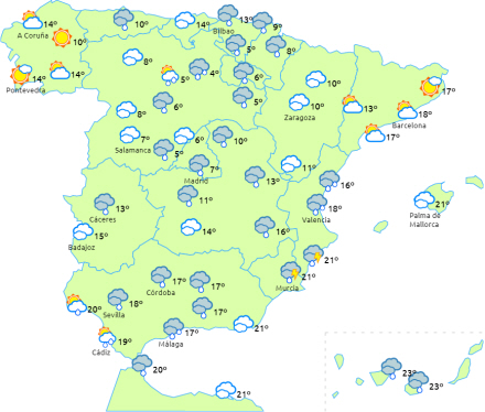 I løbet af dagen vil der dannes et uvejr i det vestlige af halvøen, der vil medføre en strøm af fugtig og ustabil vind til den sydøstlige halvdel af halvøen. Således forventes skyet eller overskyet himmel og nedbør ledsaget af lejlighedsvise tordenbyger i den østlige og sydlige halvdel af halvøen, de nordlige af De Kanariske Øer og på Ibiza.