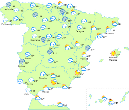 Bygerne kan lokalt være tunge eller vedholdende i starten i det nordlige af Valencia Regionen og i slutningen af dagen i bjergene i de indre egne.