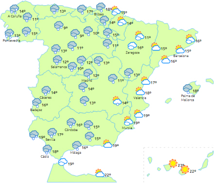 Tung eller vedvarende nedbør i det vestlige Galicien, de indre bjergegne og Andalusien, mens det handler om stærk eller meget stærk vind i Galicien og og højlandet i fastlandets nordvestlige halvdel.