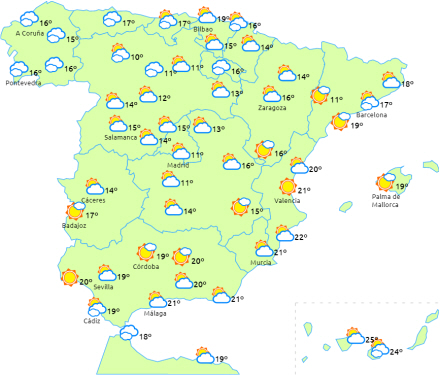 Skyet eller overskyet i Galicien og det nordlige Castilien y León med svag nedbør i det vestlige Galicien i de tidlige morgentimer, men efterhånden generelt bare letskyet.
