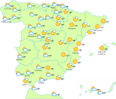 Generelt stigende temperaturer på halvøen, Balearerne og De Kanariske Øer, men det er særligt mærkbart i de sydlige indre egne af halvøen, og i løbet af dagen kommer vi en del højere end sædvanlige temperaturniveauer for årstiden.
