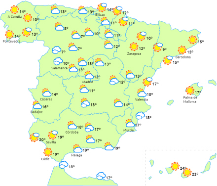 Faldende dagstemperaturer i og omkring bjergområderne og få ændringer i resten. Faktisk bliver også nætterne lunere i det vestlige Galicien, så der kommer kun let frost i de centrale og nordlige dele af halvøen.