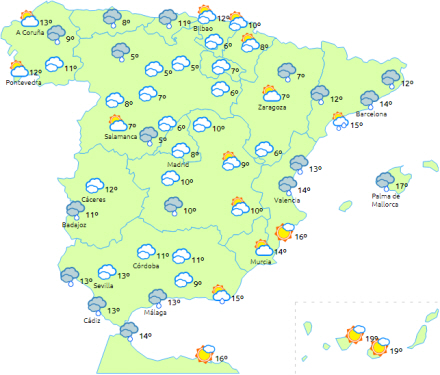 Faldende temperaturer på De Kanariske Øer og i resten generelt. Frost i den nordlige halvdel af fastlandet og bjergene i sydøst. Tungest frost i Pyrenæerne.