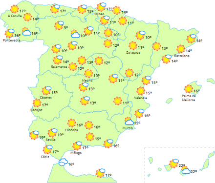 Stigende dagstemperaturer i Cantabrian, de øst, indre egne og Ebro-dalen, mens de falder i den sydlige tredjedel og på De Kanariske Øer.