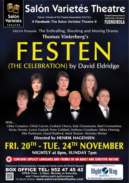 For første gang i Salon Varietes 30 årige historie præsenteres et dansk stykke kvalitets-teater. Det drejer sig om dramatiseringen af den prisbelønnede film, FESTEN - The Celebration - der er oversat til engelsk og bearbejdet af David Eldridge.
