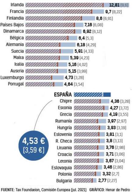 Hvis det er dyrt at ryge i Spanien, er det en luksus i Irland. Det er det land, der har den højeste beskatning af de 27 EU-lande på 9,60 EUR. Gennemsnitsprisen for en pakke cigaretter i Irland er 12,81 EUR, hvilket betyder, at hver cigaret koster 64 cent. En irsk person, der ryger en pakke om dagen, bruger 384,30 euro om måneden, mens månedstallet i Spanien er 135,90 euro.