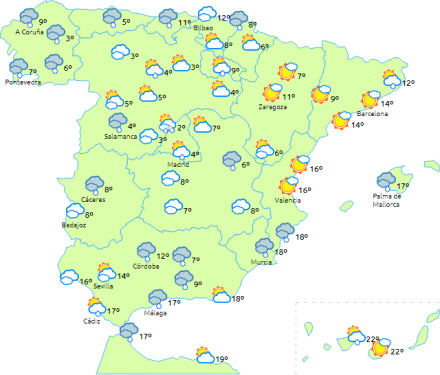Faldende temperaturer i dagtimerne på Atlanterhavssiden og langs den cantabriske kyst samt i Pyrenæerne med ellers få ændringer i resten. Frost til den nordlige halvdel af halvøen og de sydøstlige bjerge - lokalt tung frost i Pyrenæerne.