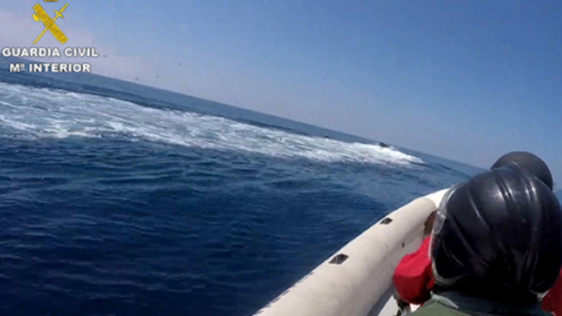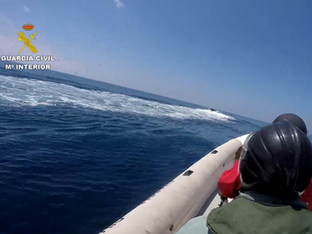 Guardia Civil-betjente satte efter i båd og helikopter, da en gruppe smuglere forsøgte at undslippe i en af deres lynhurtige gummibåde. Politiet fik afskåret fartøjet efter at have jagtet den på åbent hav.