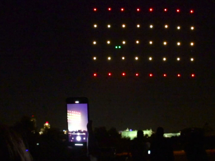 I alt 40 droner, der var programmeret og udstyret med flerfarvede LED-lamper, oplyste himlen i forskellige former og viste flag fra de mest berørte lande.