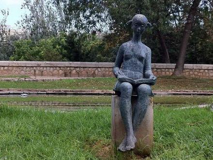 Skulpturen 'La niña de las coletas' er en pige med rottehaler, der sidder med en åben bog på skødet.