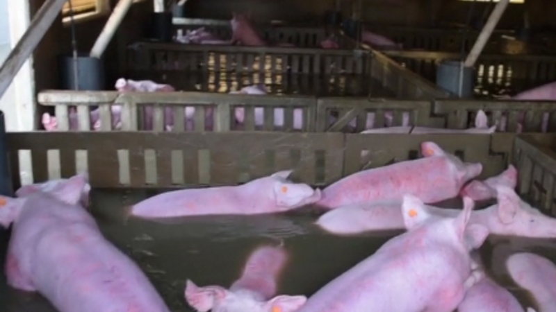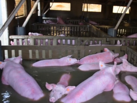 Chokerende optagelser er blevet offentliggjort, hvor man ser skræmte grise, der kæmper en desperat kamp i deres indhegninger på en gård i Villafranca de Ebro. Nogle af dem søger heller på ryggen af de andre, mens nogle nærmest bare bare trynen over vand.