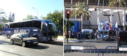 Bussen med Málaga CFs spillerne ankommer med politieskorte og modtages af tusinder fans i ekstase