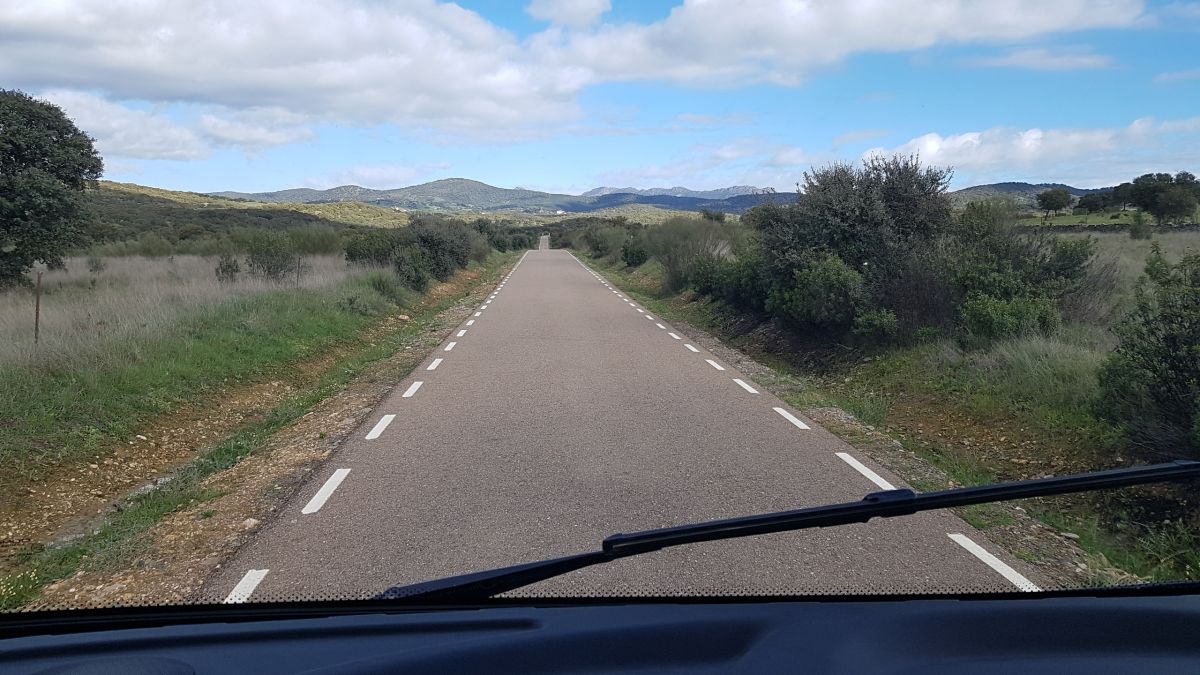 Vi kører lidt sydpå igen til Castillo Blanco, hvor vi svinger mod Alia af CC-151. Det er en meget smal vej uden bebyggelser og vi møder kun få biler. Heldigvis, for en vej på 3 ,5 m bredde med grøfter som rabat (33-30), så er der ikke meget at give af.