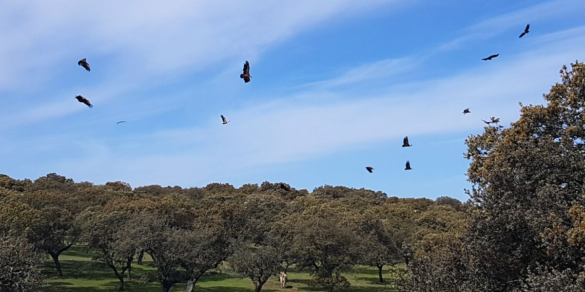 Det lykkedes, og vi følger vejen til Serrejón og videre ad EX-389. Et stykke ude af vejen ser vi nogle store fugle sidde lidt inde på marken. Da vi stopper, letter de. Det er gribbe, finder vi ud af. Og der er mange, 30 -40 stykker.