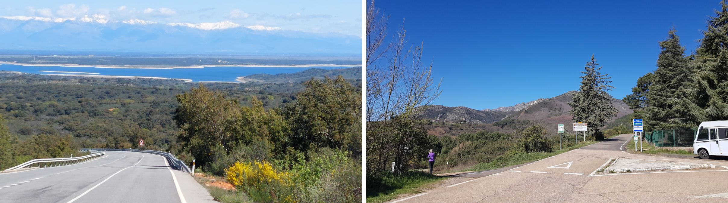 Med en skyfri blå himmel som baggrund, så er det helt fantastisk. Sne i bjergene i det fjerne på vej ned mod Embalse de Valdecanas.