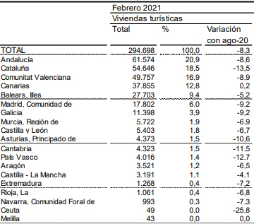I forhold til august 2020 steg antallet af turistudlejningssteder i provinserne Palencia (4,8 procent), Albacete (2,6 procent) og Las Palmas (0,9 procent).