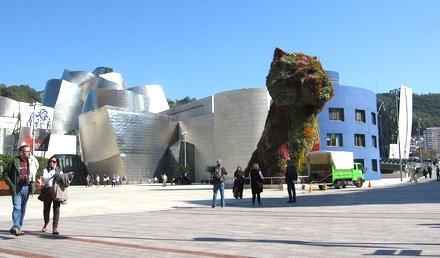 Guggenheim - et arkitektonisk mesterværk. Hunden er lavet af levende blomster
