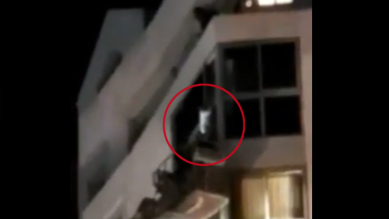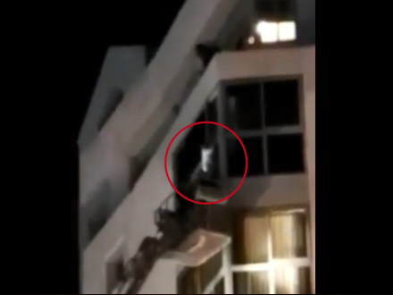 En lille pige stod udvendigt på en bygning og klamrede sig til den lukkede terrasse på syvende sal.