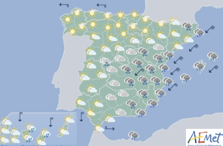 Skyet eller overskyet i store dele af Middelhavsområdet og det sydøstlige Castilla-La Mancha med nedbør - lejlighedsvis decideret uvejr med lokalt tung eller vedvarende nedbør Valencia-regionen.