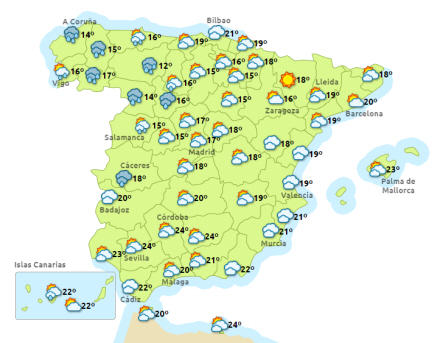 Der er intervaller med ret overskyet vejr i den nordøstlige del af landet med mulighed for regn på visse dele af kystområderne. Overvejende skyet i de andre dele af landet, og i løbet af dagen kommer der stigende uklarhed i nordvest med mulighed for let regn sidst på dagen ved de nordvestlige kyster af Galicien og i de indre egne af Sanabria.