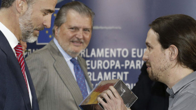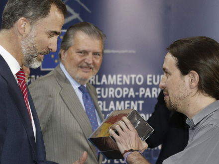 Og så falder Iglesias ironiske distance nok på plads, i forhold til den gave han så uhøjtidligt overrakte Spaniens regent, da de mødtes for første gang i Bruxelles i går.