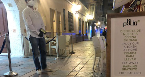 Parkeringshuset under Kirkepladsen, hvor det under normale omstændigheder kan være umuligt at finde en plads, er stort set tomt. Og så begynder vi at gå mod El Patio i Calle Troncón - med god afstand selvfølgelig!