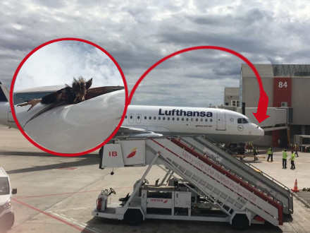 Et fly kolliderer med en sort grib, da piloten var ved at lande i Palma. Næsen på flyet blev helt ødelagt, og man var tvunget til at aflyse returrejsen til München.