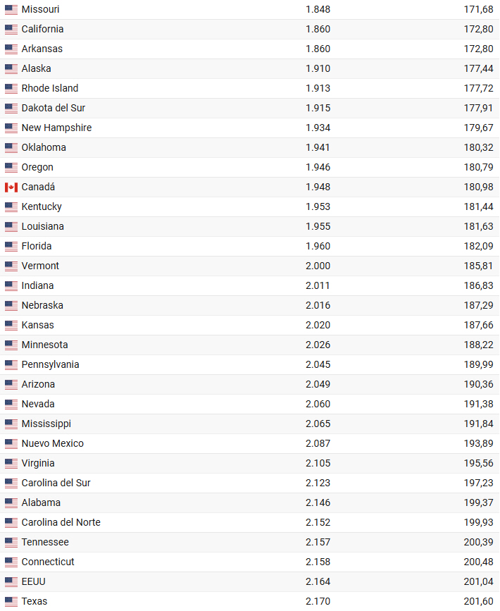 Boligsitet Idealista.com bringer et kort, som viser, at praktisk talt alle amerikanske stater overstiger 130 m2 i gennemsnit, og de er dermed langt foran samtlige europæiske lande. På kortet er målene angivet i fod, mens tabellen nederst i denne artikel viser det i m2.
