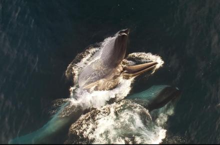 De smukke billeder viser to voksne finhvaler, der stiger til overfladen, vender siden til og skyder frem i vandet, mens de åbner deres store mund for at fange og sigte flere ton vand.