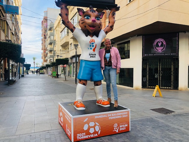 Der er i dag igen fokus på sport, og til december afholdes VM i kvindehåndbold blandt andet i Torrevieja. Her står Gitte med maskotten Lola