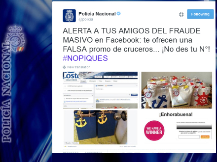 Brugerne bliver omdirigeret til en hjemmeside, hvor de får at vide, at de kan vinde præmiepakker herunder 1.000 euro i kontanter, fem billetter til et krydstogt og en T-shirt med logoet for Costa Cruceros. Det spanske rejseselskab skulle angiveligt stå bag kampagnen.