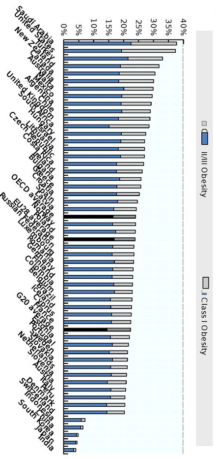 Saudi Arabien og USA er de tungeste i klassen med en procentandel af overvægtige og fede på henholdsvis 37,73 og 37,32, mens de letteste er Japan og Indien med henholdsvis 4,41 og 4,09 procent fede og overvægtige.