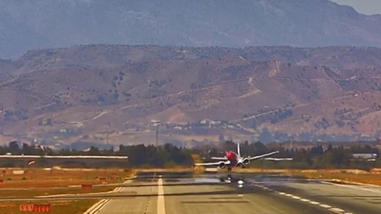 Et kraftigt vindstød og pludselig ændring af vindretning får pludselig flyet til at dreje næsten sidelæns, netop som det "kysser" asfalten.
