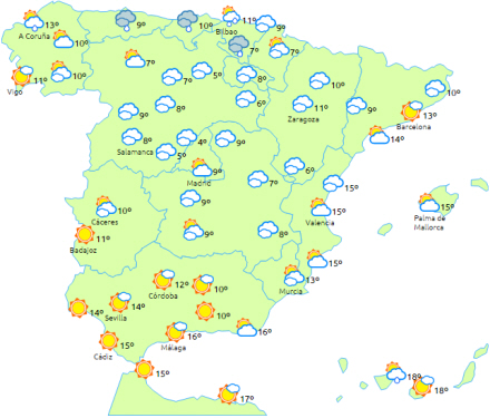 Temperaturerne er generelt langsomt på vej nedad på halvøen og Balearerne. Frost i de indre egne af den nordlige halvdel af halvøen.