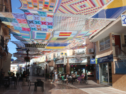 For over de centrale gader i Alhaurín de la Torre finder folk skygge fra de varme solstråler under et farverigt, hæklet kæmpe-tæppe.