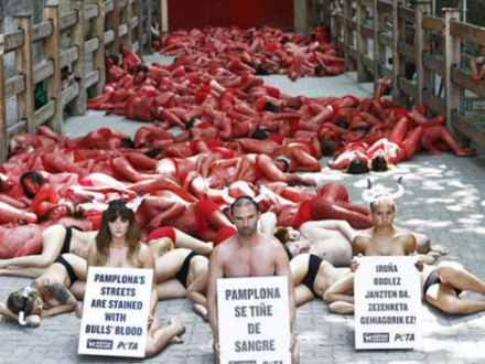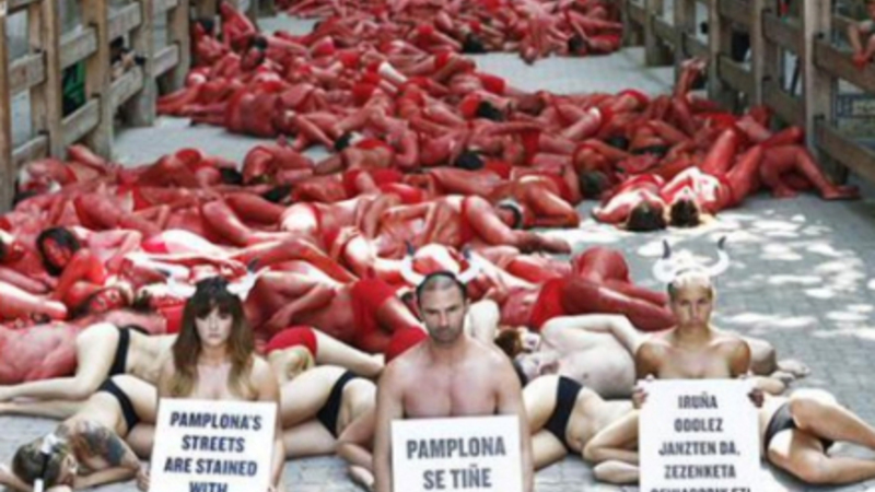 Aktivister fra PETA og Anima Naturalis var malet ind i rød farve og bar falske horn, mens de protesterede med plakater, hvorpå det stod: ”Pamplonas gader farves røde med tyrenes blod" på flere sprog.