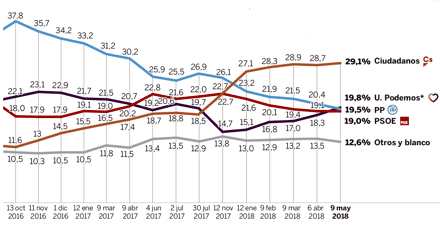 Undersøgelsen blev foretaget i dagene 7. - 9. maj 2018, og bekræfter tendensen siden sidste efterår: de “gamle” partier går tilbage og de nye frem.
