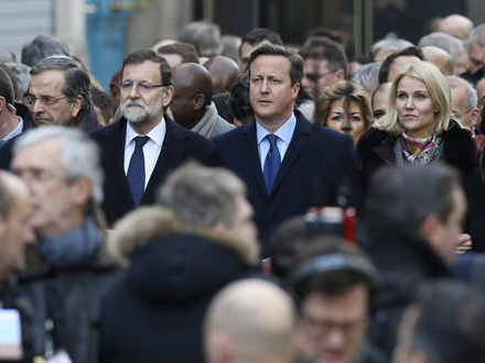 Spanske storbyer var søndag centrum for en række demonstrationer i protest mod sidste uges attentat i Paris.