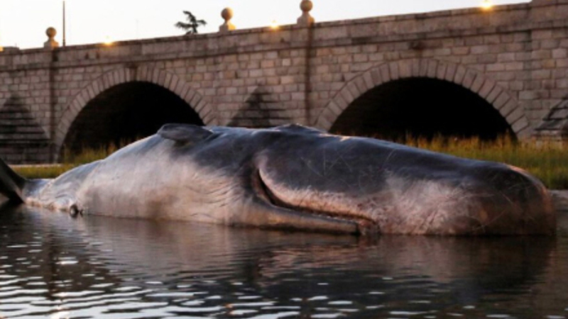 VIDEO: Folk i hovedstaden fik sig noget af en overraskelse, da en strandet hval pludselig dukkede op på Manzanares-flodens bredder.