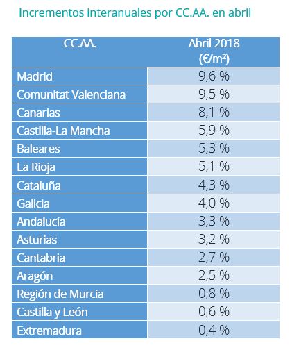 Madrid har oplevet den højeste stigning med 9,6 procent højere lejepriser end i april 2017, Valencia kommer lige efter med 9,5 procent, De Kanariske Øer 8,1 og Castilla-La Mancha 5,9 procent.