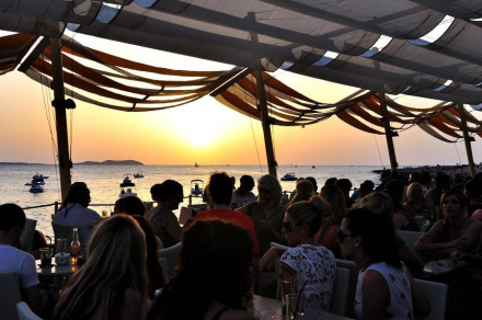 Solnedgang på en strandbar i Sant Antoni