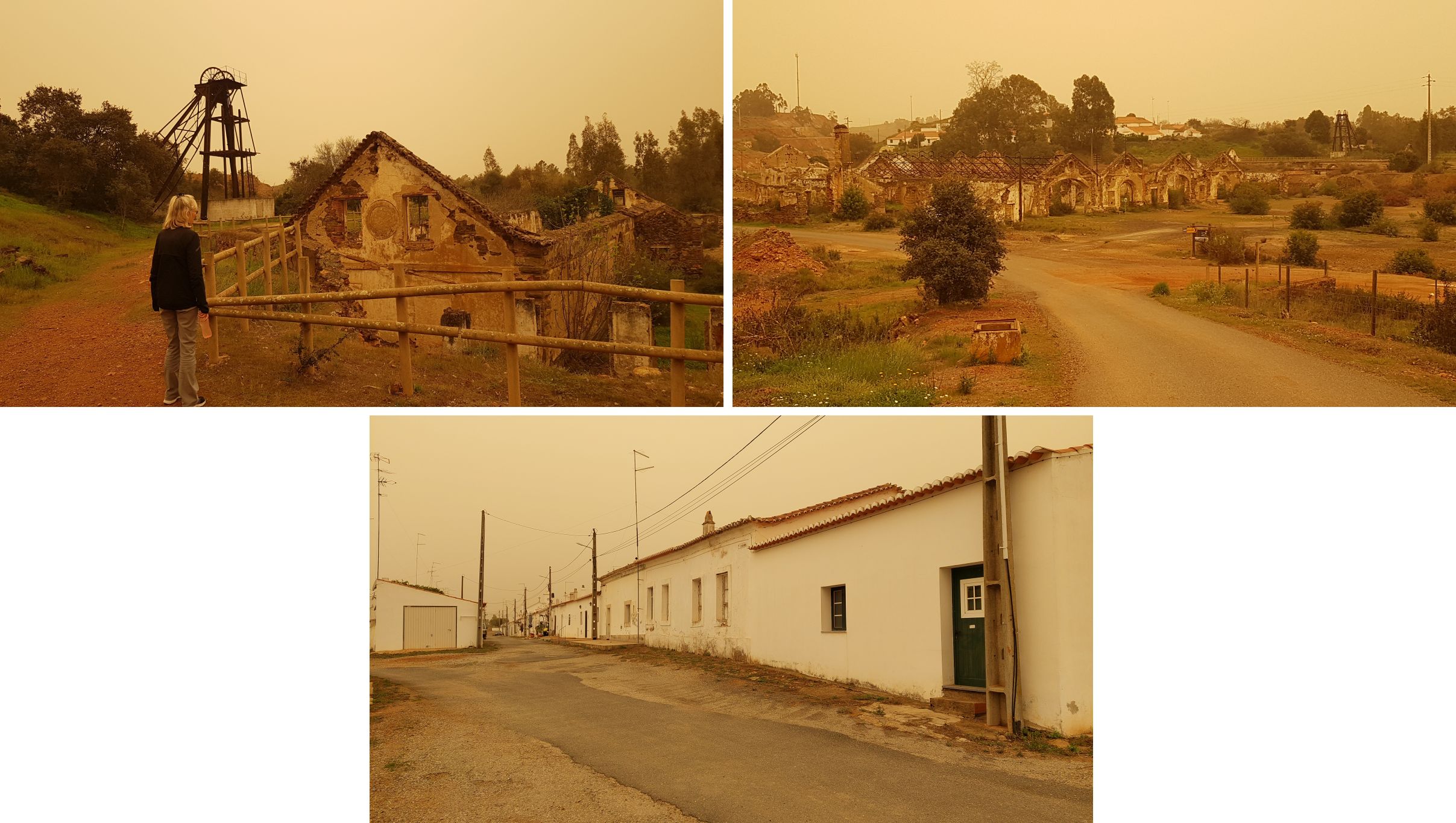 Vel ude af byen, fortsætter vi ad N265 mod Mina de São Domingos. Calimaen er her, og vi kører uden den store udsigt, vi har været vant til. Det er som en dis men mørkere. Og lyset, det er som om det ikke bliver helt lyst, ligesom på en gammel film, hvor farverne er visket ud.
