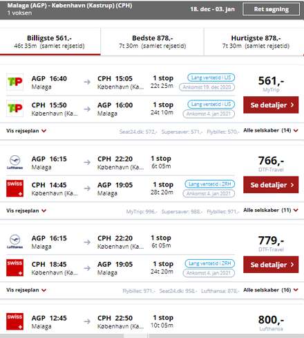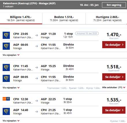 I søgemaskinen vælger du selv dine lufthavne. Du kan også vælge om det skal være direkte flyvninger eller med én eller flere mellemlandinger. “God gamle dages” luksus med at kunne vælge og vrage mellem direkte flyvninger, findes desværre ikke mere. I øjeblikket.