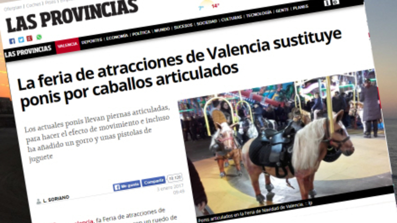 I Valencia har El Ayuntamineto forbudt brugen af levende dyr i alle former for cirkus og anden fest, så La Feria de Atracciones de Navidad har byttet de stakkels små ponyer ud med kunstige.