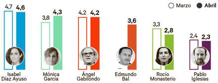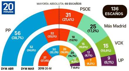 PSOE med Ángel Gabilondo i spidsen falder fra 37 til 31 mandater, mens Más Madrid styrker sin position fra 20 mandater ved valget for to år siden til 25 mandater. Partiets leder, Mónica García, styrker også sin popularitet.