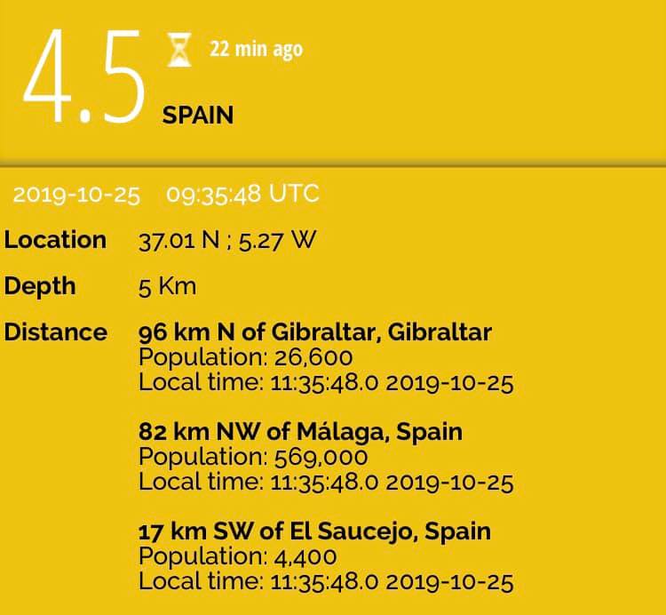 Mærkede en let rysten. Jeg bor nær ved St Pedro de Alcantara, lidt op ad Rondavejen.